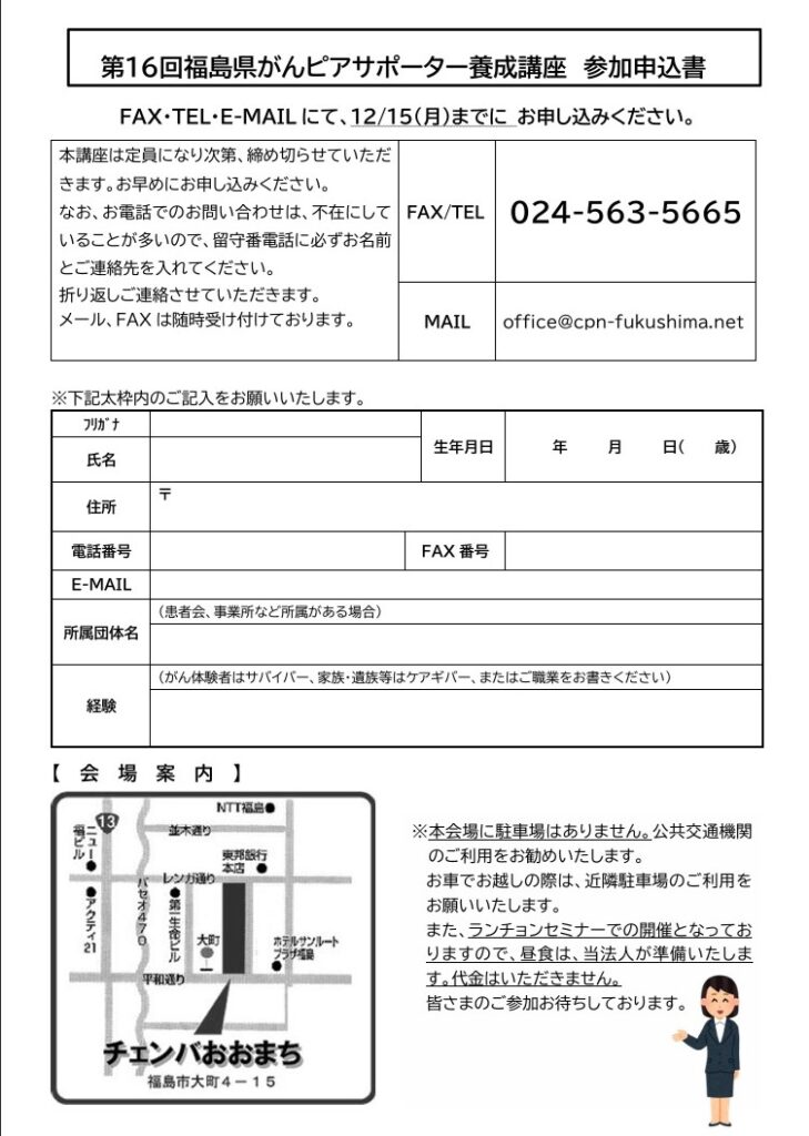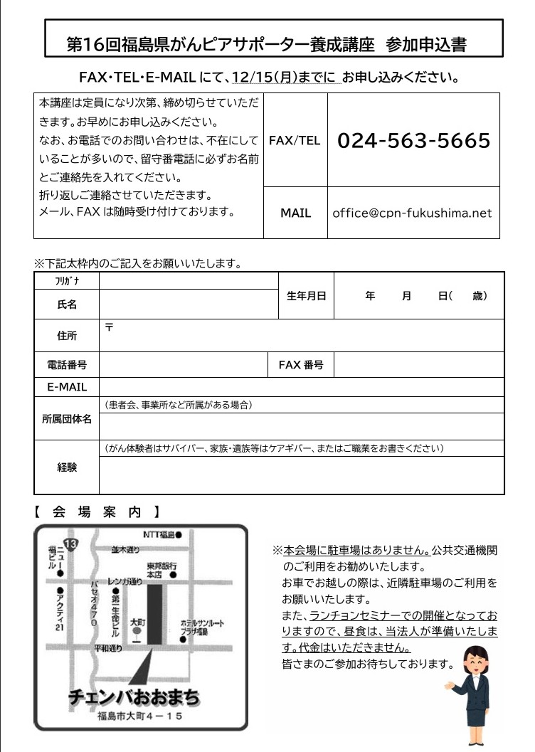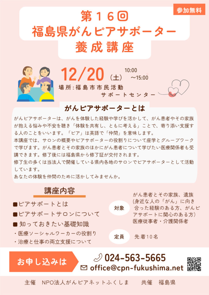 【受講生募集】第16回福島県がんピアサポーター養成講座 12月20日(土)に福島市市民活動サポートセンターにて「第16回福島県がんピアサポーター養成講座」開催いたします。受講生募集中です。 参加ご希望の方、ご興味のある方はお気軽にお問合せ下さい。皆さまのご参加お待ちしております。詳細は下記チラシをご確認下さい。表面のチラシをクリックする申込書も一緒にダウンロードできます。