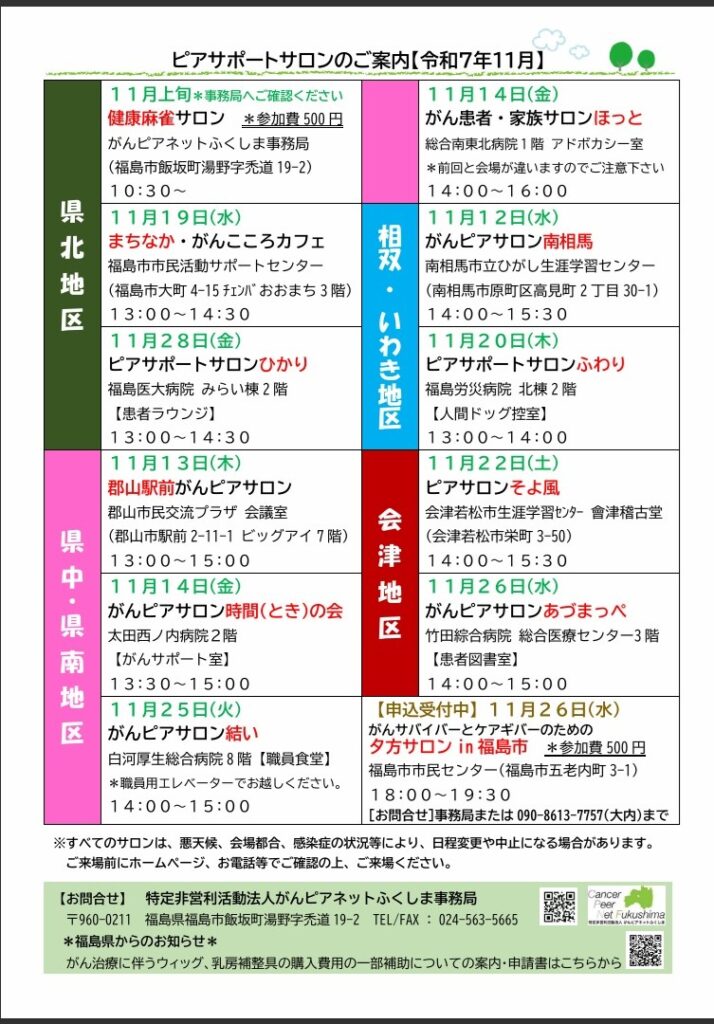 各ピアサポートサロンは、 下記の日程で開催されます。